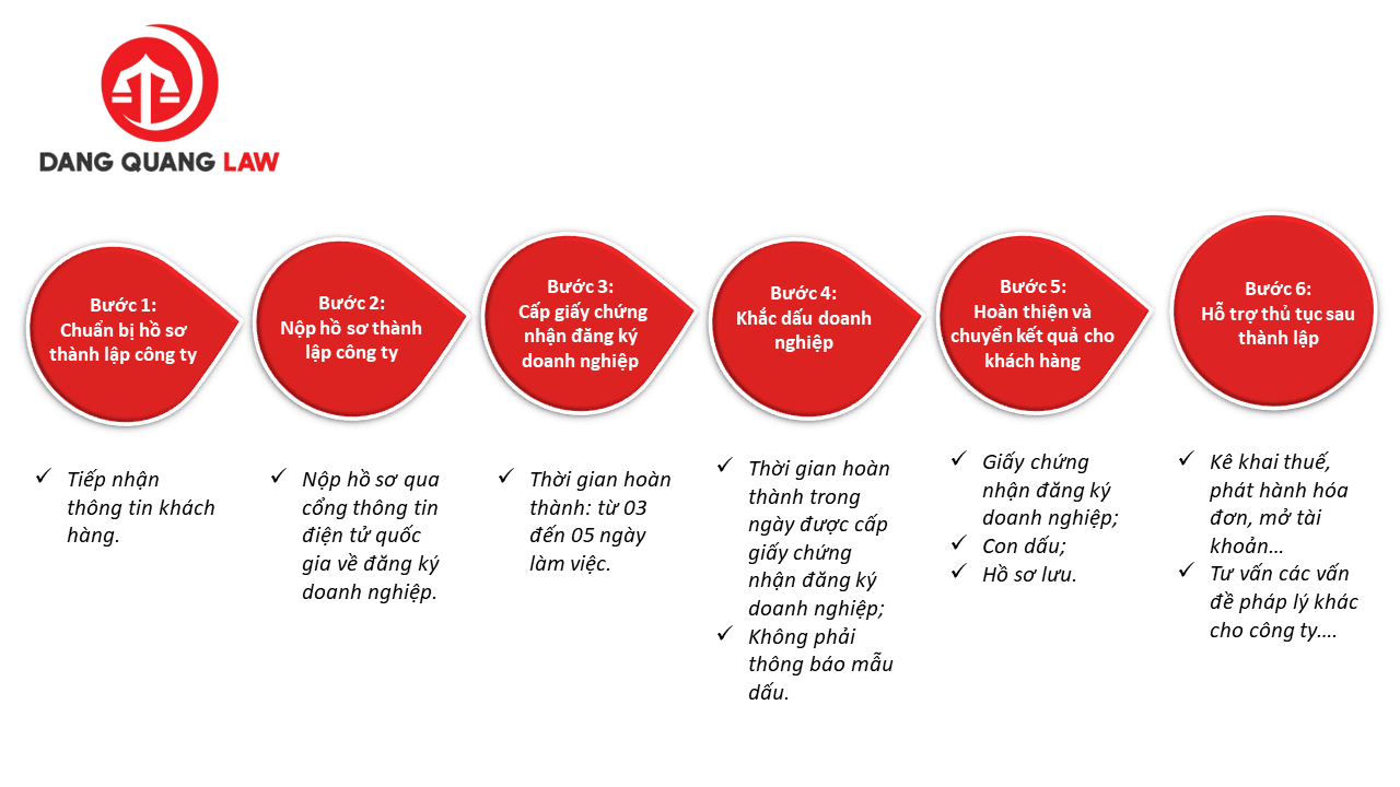 Ngay sau khi luật sư tiếp nhận đủ thông tin và tư vấn các vấn đề liên quan đến tên công ty, trụ sở công ty, ngành nghề kinh doanh dự kiến của công ty, thông tin về thành viên, cổ đông sáng lập của công ty, vốn điều lệ công ty, thông tin người đại diện theo pháp luật của công ty. Trên cơ sở các thông tin Quý khách hàng cung cấp, Công ty Luật Đăng Quang tư vấn các vấn đề pháp lý liên quan, soạn thảo hồ sơ thành lập công ty để chuyển Quý khách hàng trong thời gian tối đa 01 ngày làm việc kể từ ngày nhận đủ thông tin của khách hàng.