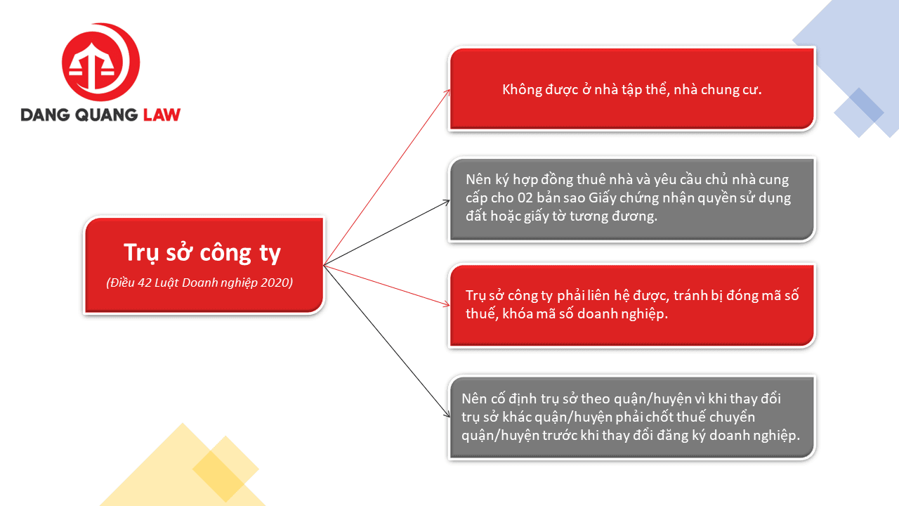 • Theo quy định của pháp luật hiện hành, chung cư và nhà tập thể không được đăng ký làm trụ sở công ty cũng như địa chỉ của chi nhánh, văn phòng đại diện, địa điểm kinh doanh của công ty.