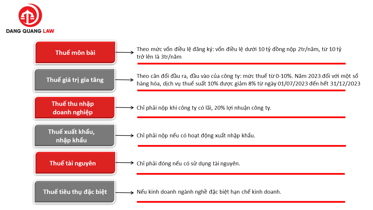 Khi thành lập công ty, doanh nghiệp phải thực hiện đóng các loại thuế nào? Mức thuế phải đóng là bao nhiêu? Dưới đây là những lưu ý về thuế và các loại thuế doanh nghiệp phải thực hiện nghĩa vụ khi thành lập doanh nghiệp trong năm 2023.